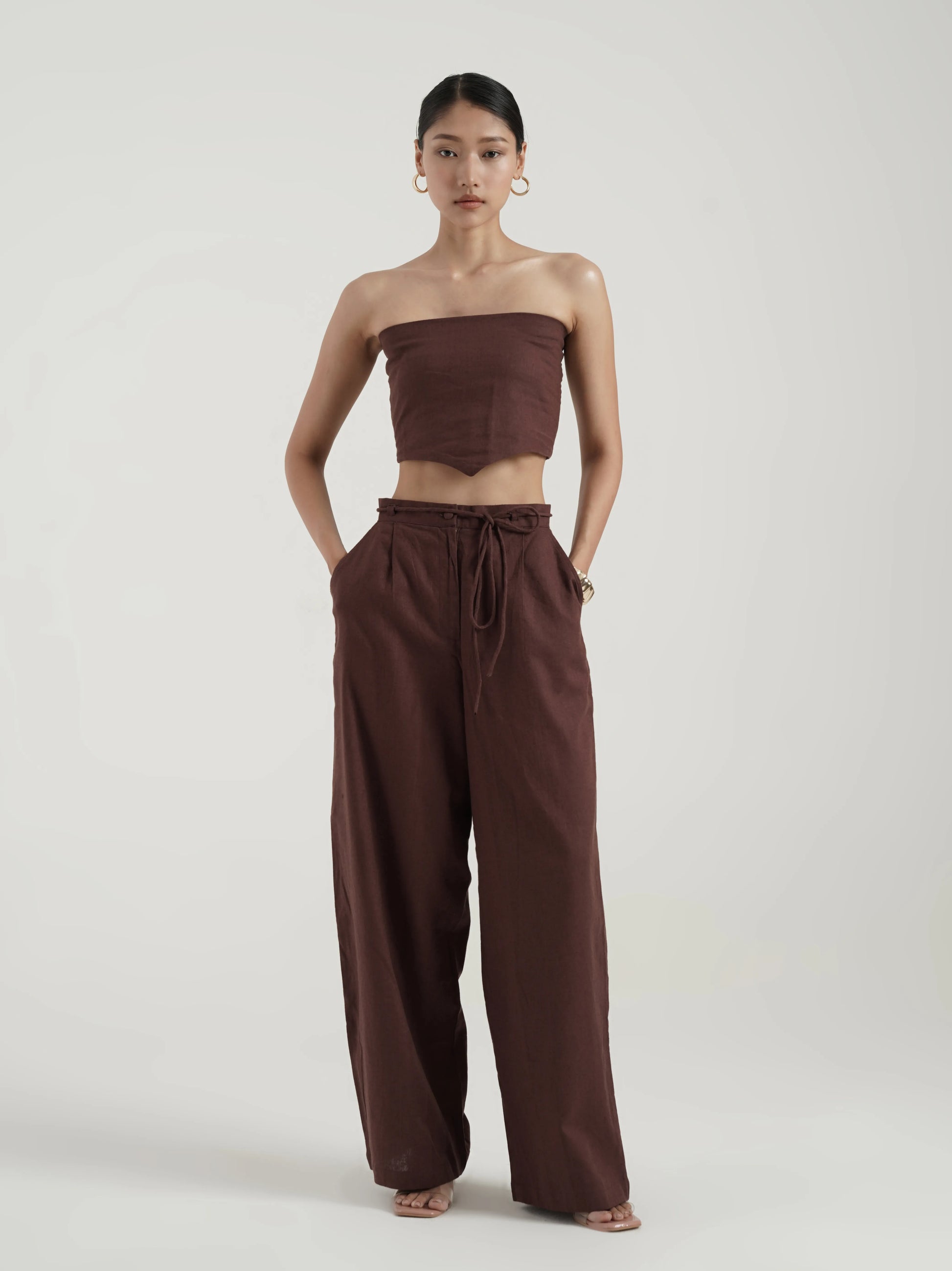 Noa Co-ord Set — a breezy, bold, and flattering ensemble crafted for your sun-drenched getaways and evening escapes. Featuring a structured, strapless bandeau-style top with a playful front twist and side cut-outs, it beautifully sculpts the waist. Paired with high-waisted, wide-leg pants this look strikes the perfect balance between comfort and chic. Style it with statement accessories and minimal sandals for an effortless day-to-night vibe.
